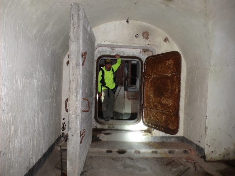 三门岛岛上有足以抵御原子弹的20多条总长达约5公里长的地下工事,30多个强大的隐蔽火力点和纵横交错的战壕。从这里进入,右边有一个机枪口,左右则刚好可以进入一个人通道。。