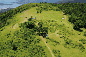 山顶有处平原,就是昂平,是个高山营地。每逢假日,许多滑翔伞爱好者在此翱翔天际。