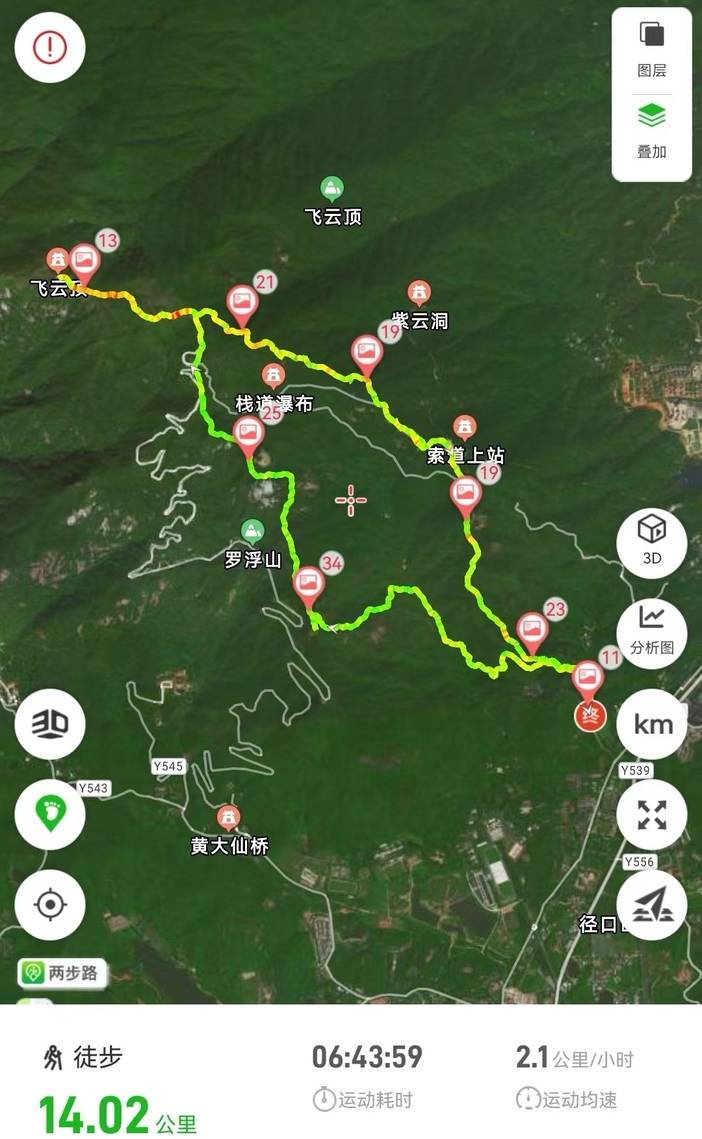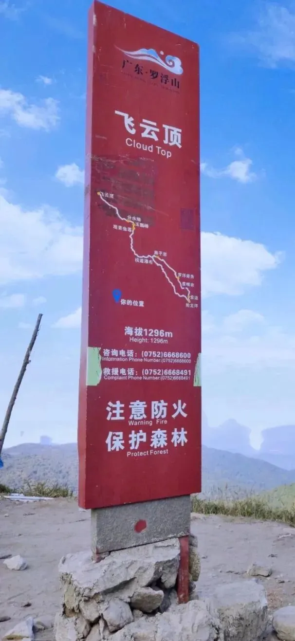 惠州博罗景峰山庄→阿婆髻→分水坳→飞云顶→分水坳→好汉坡→燕子沿→摩崖石刻→朱明洞鹰嘴岩→天象台→景峰山庄(全程约15公里)