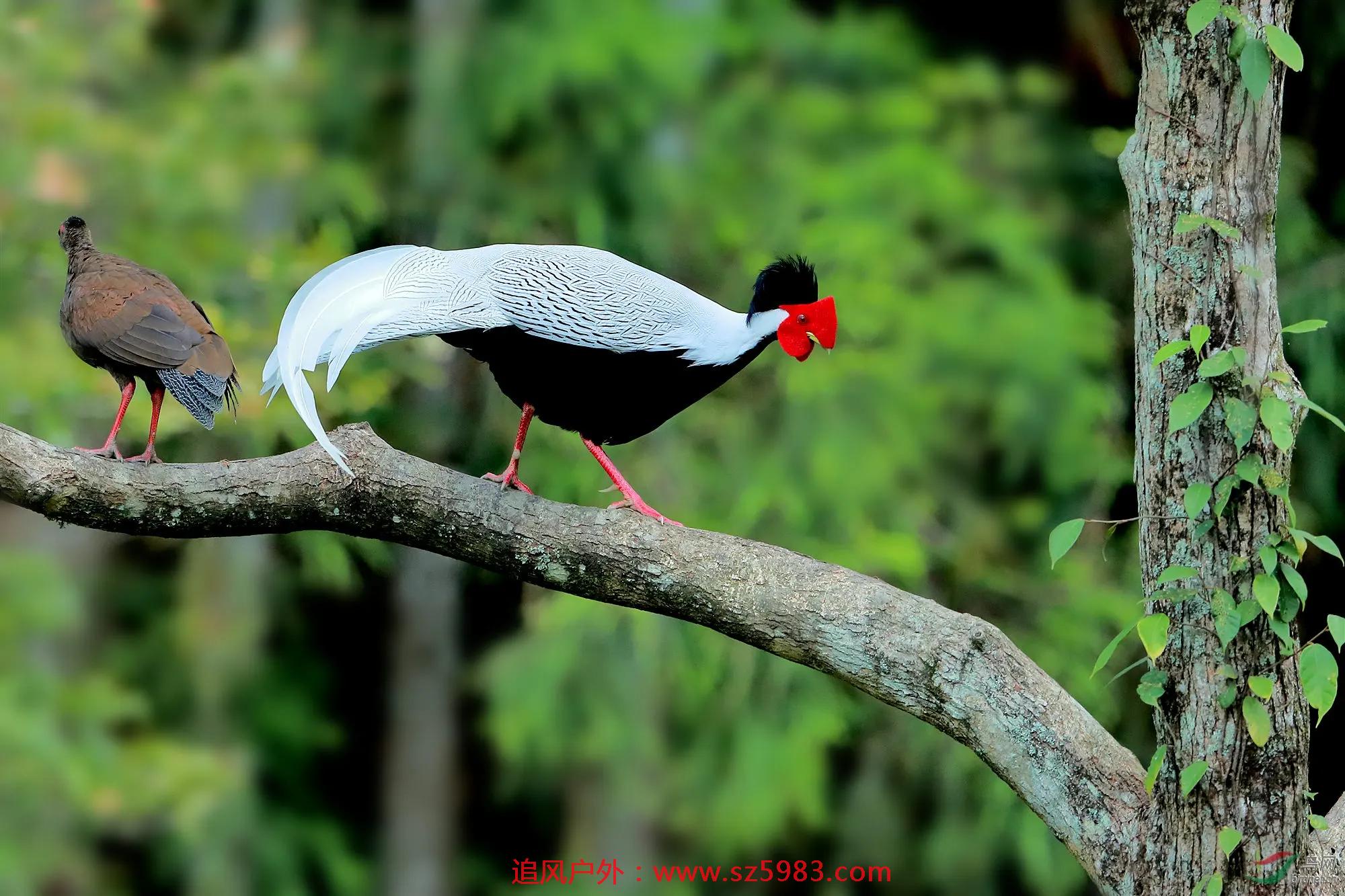 白鹇(学名:Lophura nycthemera):是雉科鹇属大型鸡类。雄鸟全长100-119厘米,雌鸟58-67厘米。头顶具冠。嘴粗短而强壮,上嘴先端微向下曲,但不具钩;鼻孔不为羽毛所掩盖着。翅稍短圆。尾长。跗蹠裸出,雄性具距,但有时雌雄均有;趾完全裸出,后趾位置较高于他趾。雌雄异色;雄鸟上体白色而密布以黑纹,头上具长而厚密、状如发丝的蓝黑色羽冠披于头后;脸裸露,赤红色;尾长、白色,两翅亦为白色。下体蓝黑色,脚红色。雌鸟通体橄榄褐色,羽冠近黑色。