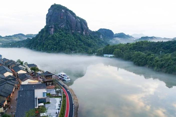 九龙水寨环抱在碧波荡漾的翠江怀里,天生丽质,美得不可方物,两岸丹霞、峭壁森然而立,直指云霄,厚重而伟岸。这就使得九龙水寨刚柔并济,既有二八佳人的温婉曼妙,又有关东大汉的豪迈沉雄。