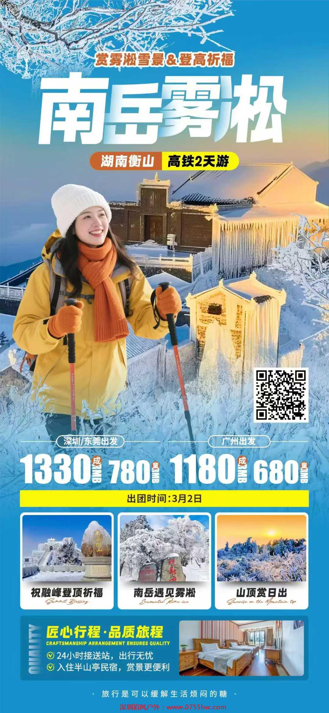 请各位贵宾于提前一小时自行抵达出发高铁站刷身份证进入候车室;(深圳北和虎门直达衡山西车次少,深圳北和虎门出发的小伙伴多数需要到广州南中转,以票务最终出票为准。如无上午到衡山西直达车次就出到衡阳东的车次)乘坐动车前往衡山西/衡阳东(车乘3个小时)元旦或春运高峰期,无二等座时我们将安排抢一等座,差价145元/人领队现收。抵达衡山西/衡阳东后有专人接站后乘坐接驳车到衡山脚下。