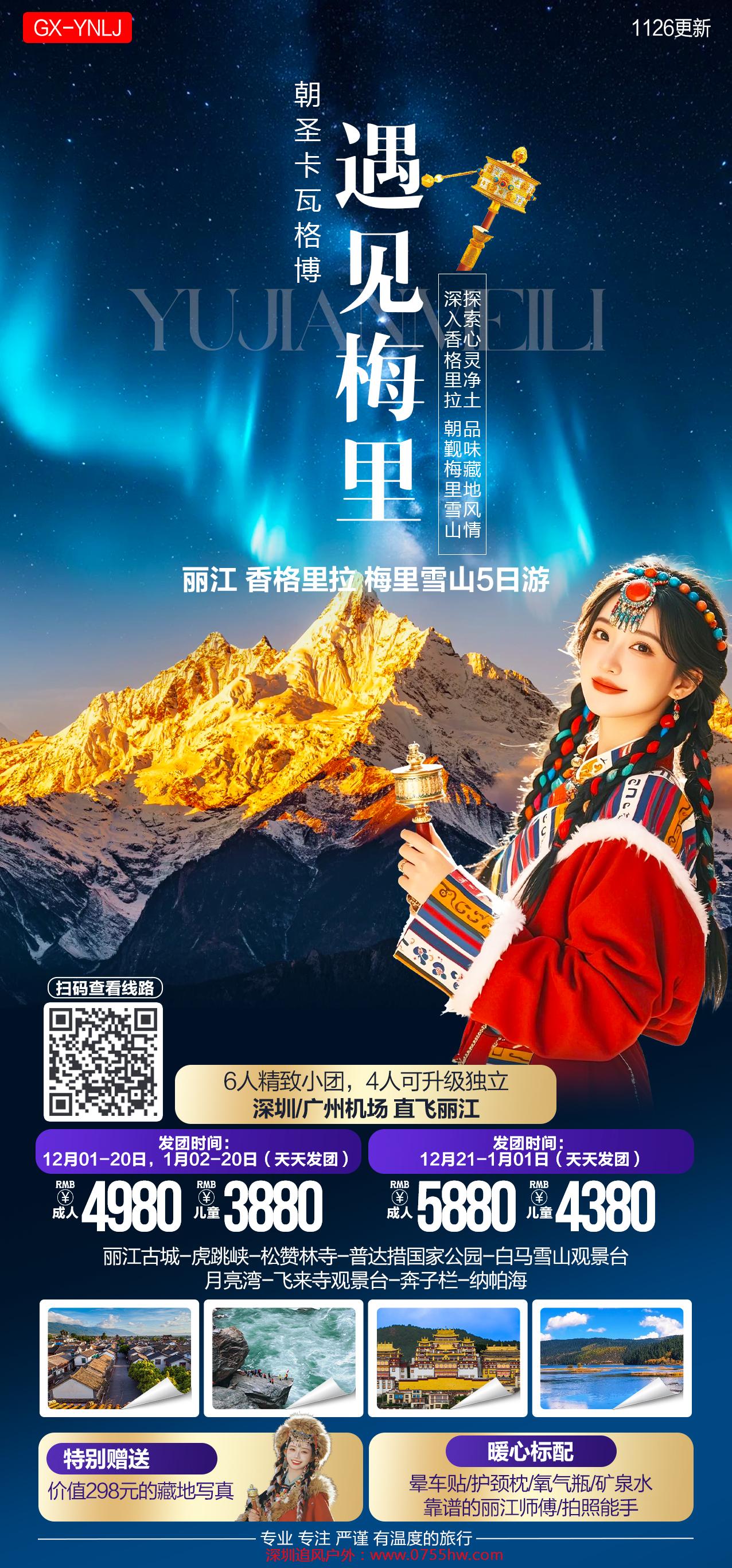【特别提示】梅里雪山沿线的经济欠发达,住宿酒店的设施设备及服务均与经济发达地区有较大差异,造成不便请知悉并谅解。