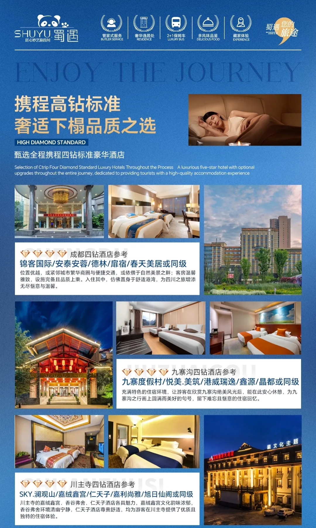 [游览] — 九寨沟风景区、黄龙风景区、都江堰风景区or中华大熊猫苑 [尊贵] — 全程入住网评四钻 [纯粹] — 无年龄地域限制,全程不进购物店 [独家] — 有趣的玩法百里挑一,不走常规的纯玩九寨之行 [餐食] — 九寨沿线两大特色餐+藏式民俗美食,餐餐惊喜餐餐地道 [礼遇] — 外宾服务礼遇、智能云端专享客服、最优导游带团资格、豪华空调大巴 |
