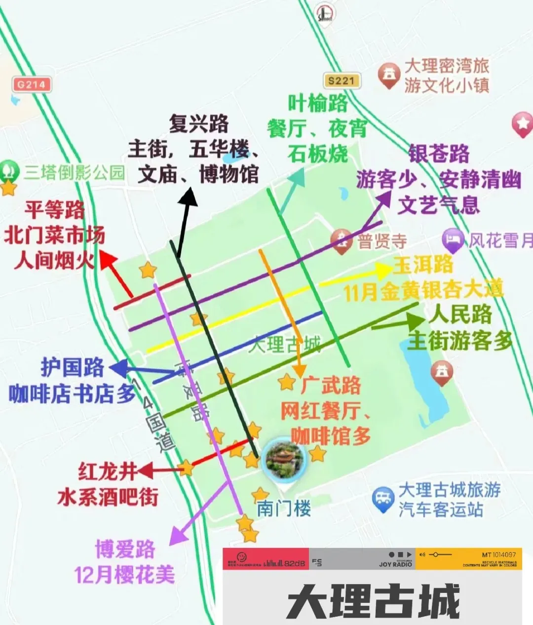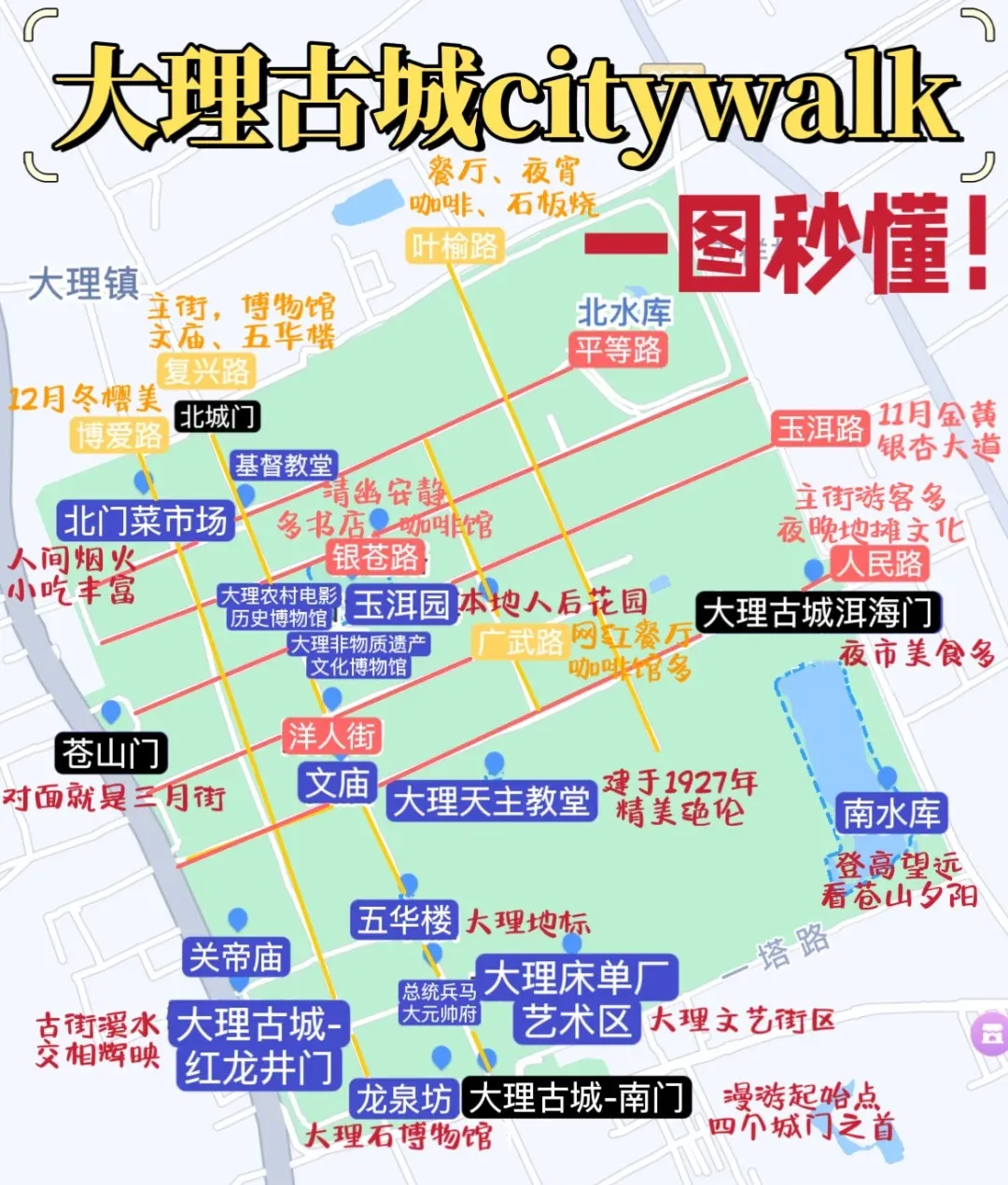 爱热闹版:古城南门→五华楼→红龙井(酒吧一条街)→博爱路(商业街)→人民路(摊位、小酒馆)→广武路(文艺网红店)→玉洱路→叶榆路→人民路→洱海门