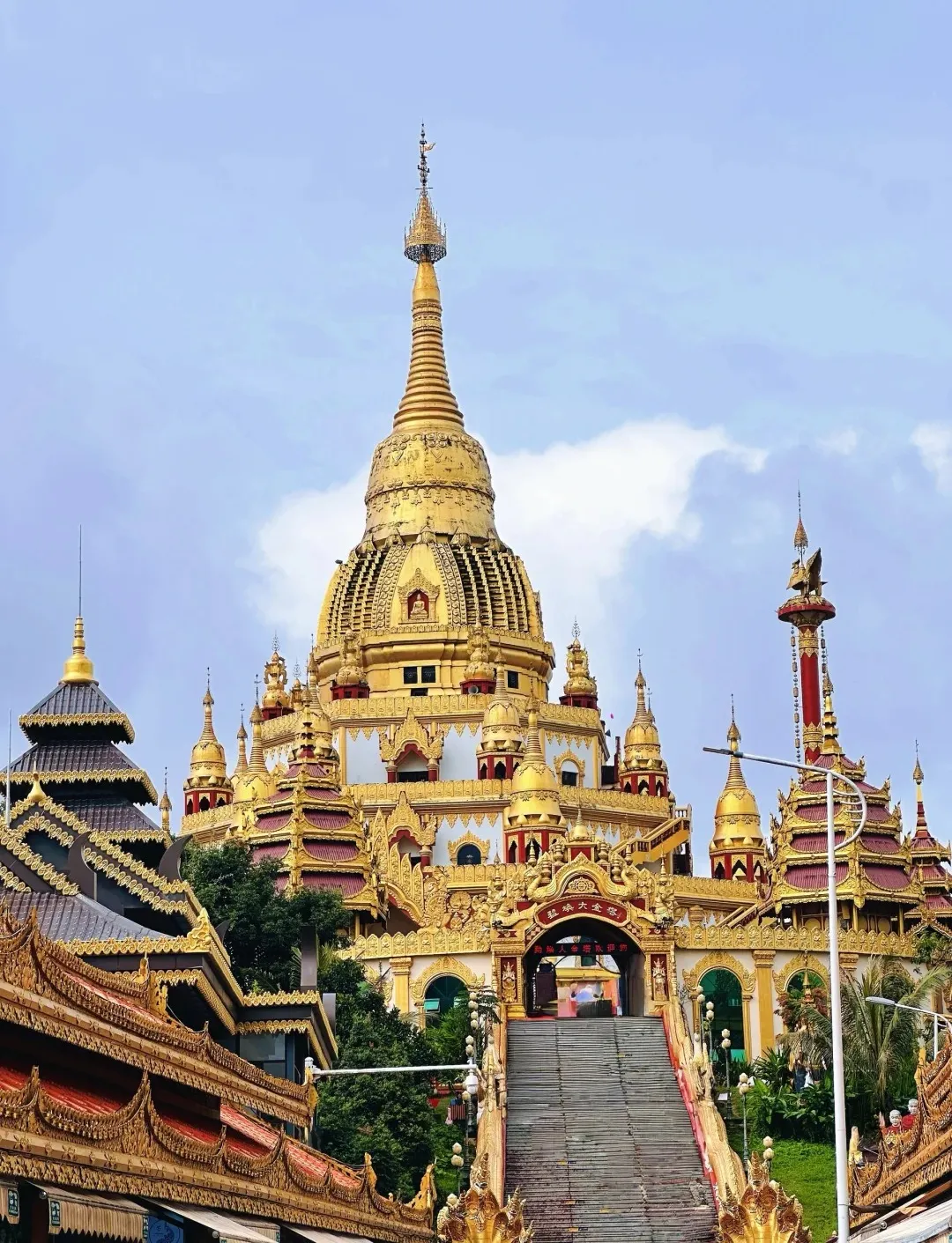 吃过午餐后前往芒市标志性景点【勐焕大金塔】(游览时间1小时左右)座落在云南省德宏州州府-芒市东南部孔雀湖畔的雷牙让山顶。青山绿水间的“勐焕大金塔”光彩夺目,金光灿灿,显得雄伟壮观,是芒市标志性的建筑,也是生活在这里的傣族人民的圣地;勐焕大金塔是中国第一金佛塔,亚洲第一空心佛塔。