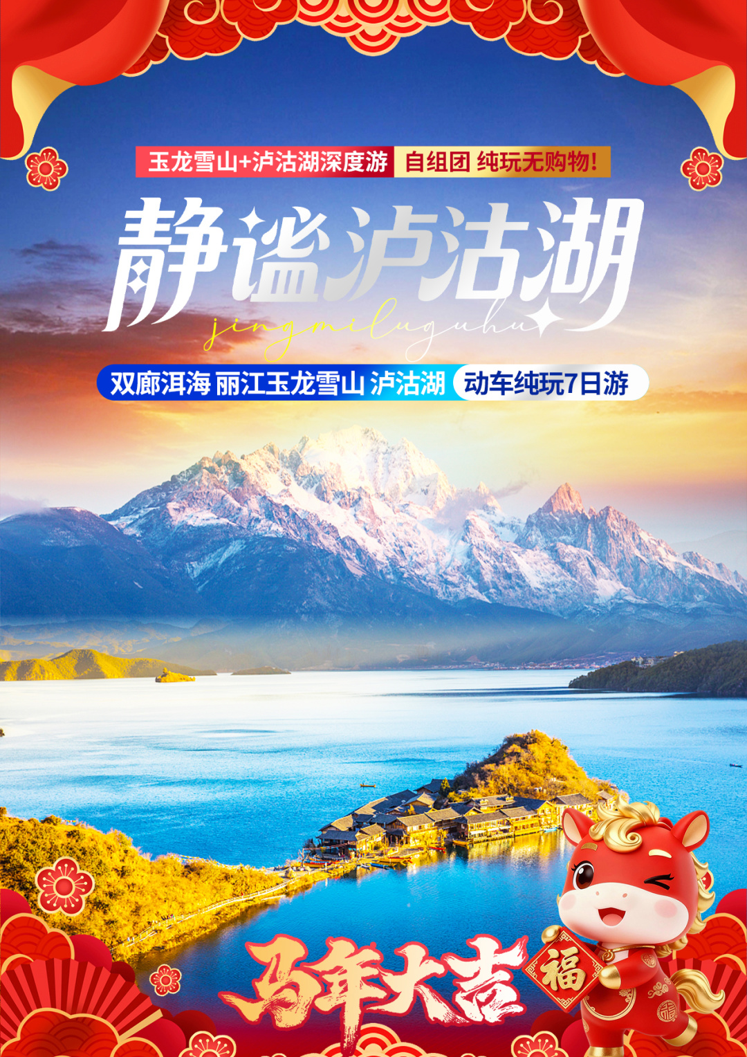 3、门票:丽江玉龙雪山景区门票,玉龙雪山冰川公园大索道,景区内观光大巴车车费,印象丽江费用;南诏风情岛摆渡车费用,大理花海吉普车旅拍费用,泸沽湖门票,泸沽湖划船,泸沽湖篝火晚会费用;