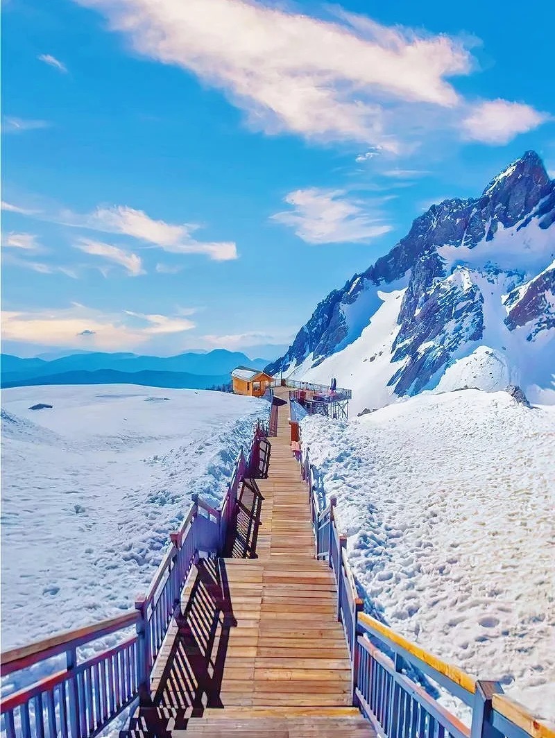 玉龙雪山:十三座雪峰连绵 75 公里,宛如一条银色巨龙横卧云际,鳞甲在阳光下流转生辉。主峰扇子陡海拔 5596 米,如擎天玉柱直刺苍穹,在蓝天映衬下尽显雄奇险峻。