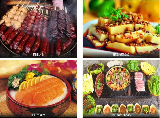 4、花马街:有三文鱼、腊排骨等美食,还有鸡豆凉粉、米灌肠等纳西族特色小吃,价格较古城低。
