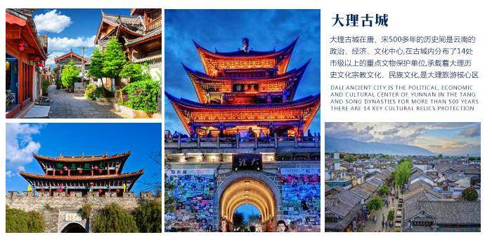 早餐后,游览“文献名邦”、南诏国都城——【大理古城、洋人街】,大理古城又名叶榆城、紫禁城、中和镇。古城其历史可追溯至唐天宝年间,南诏王阁逻凤筑的羊苴咩城(今城之西三塔附近),为其新都;