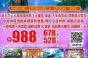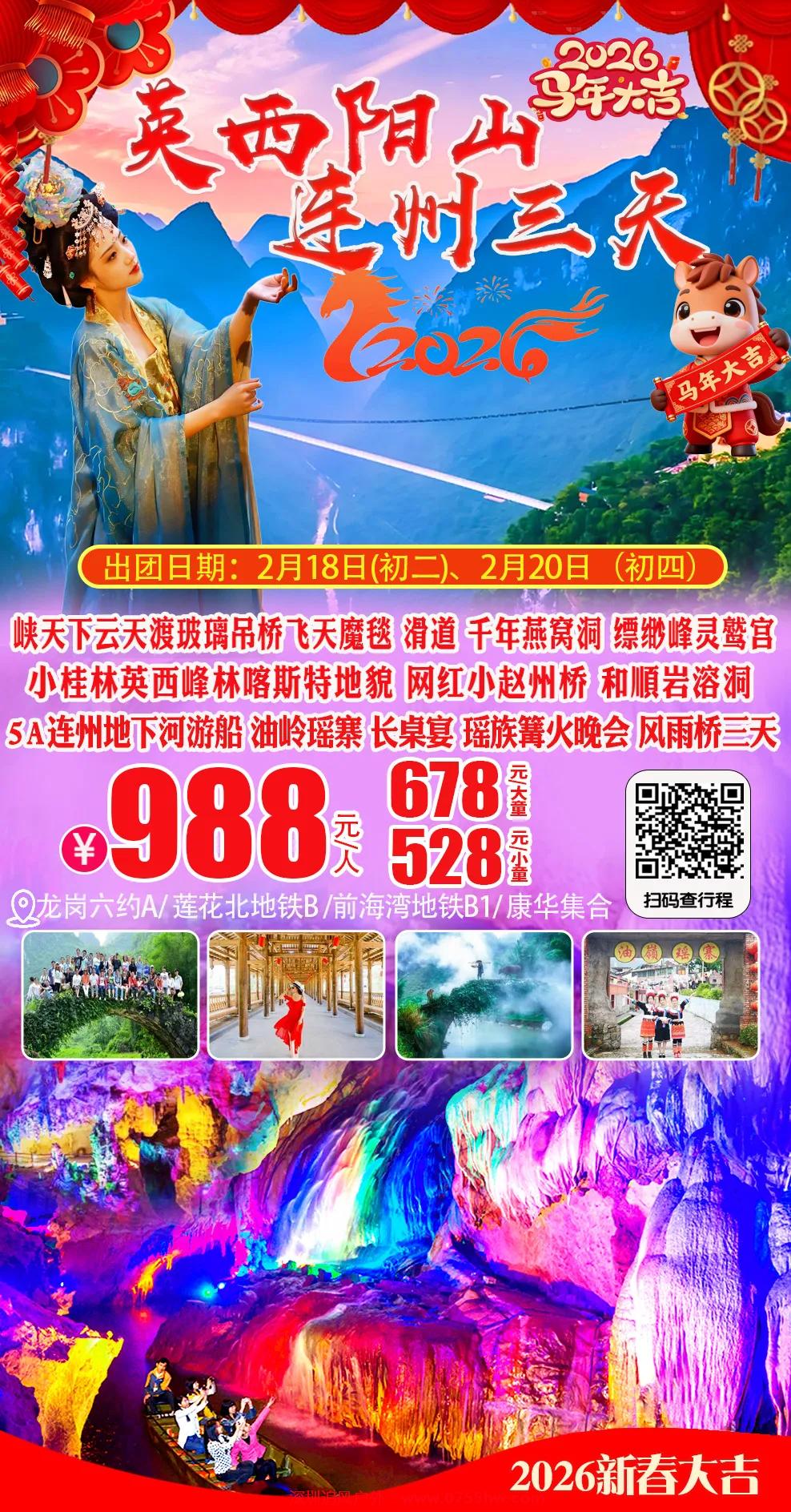 【连州3天】2026春节连州地下河 峡天下玻璃吊桥 飞天魔毯滑道 千年燕窝洞 英西峰林小赵州桥 溶洞 油岭瑶寨三天 [复制链接]
