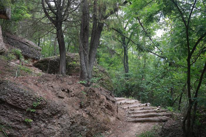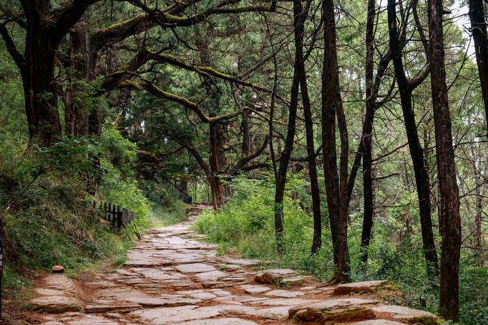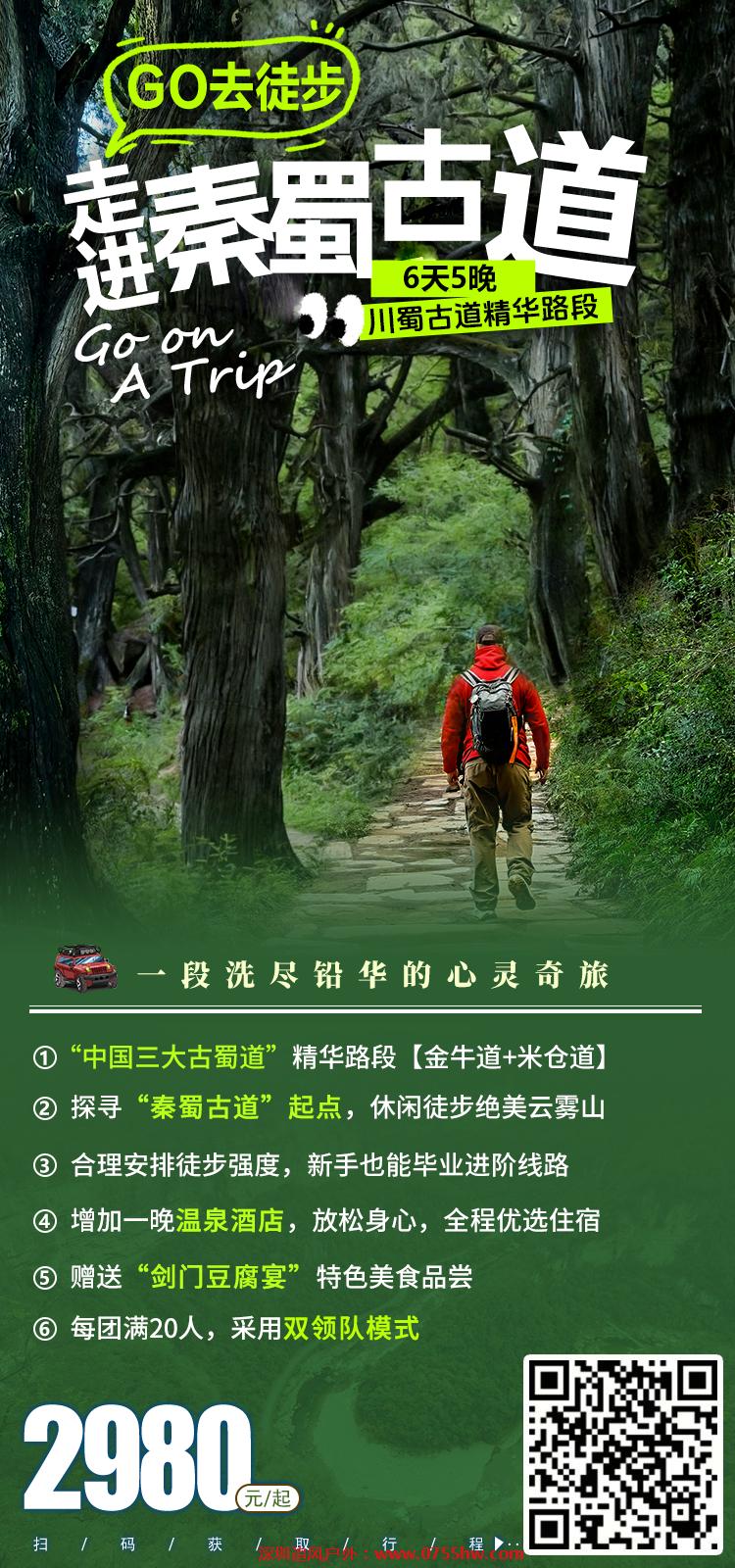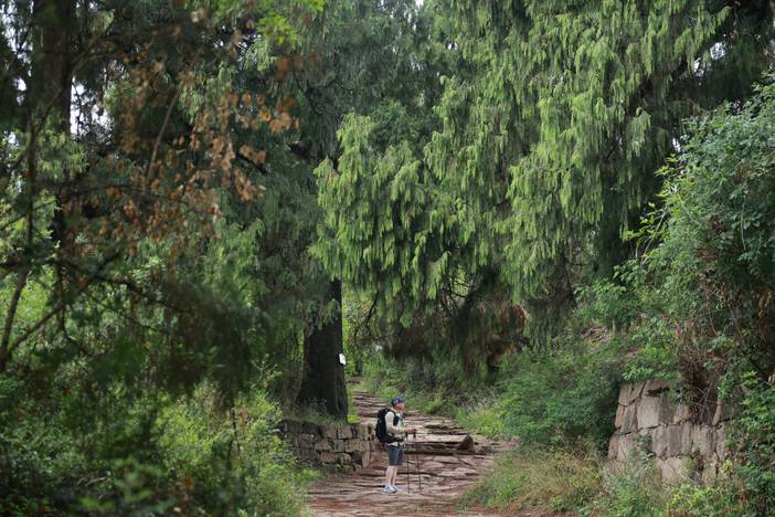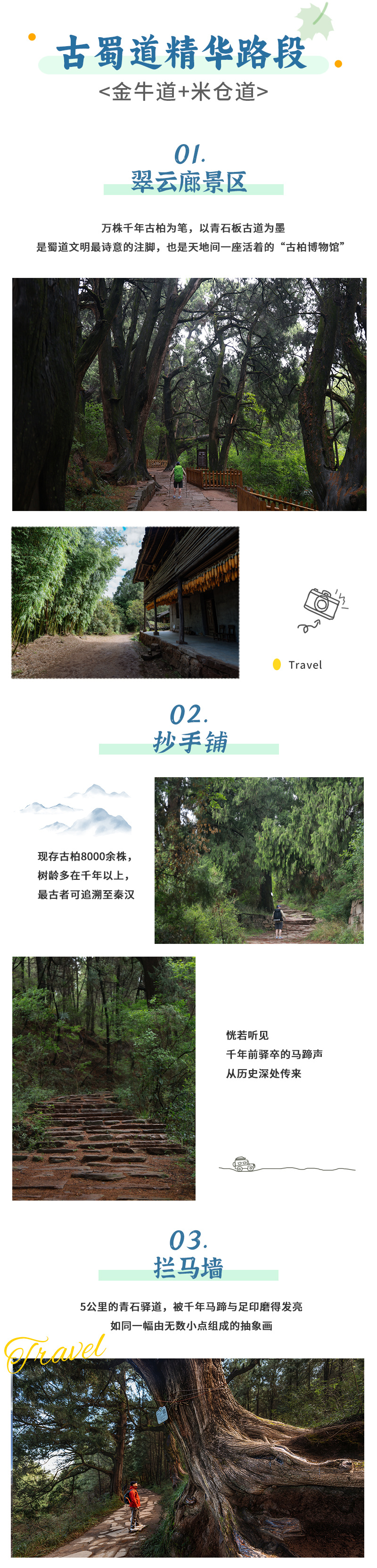 今天我们徒步的是中国古代川陕交通的主动脉-【金牛古道】。这里青石铺道,古柏参天,行走在这里,似乎有些穿越时空的错觉。尤其是最精华的【拦马墙】段,千百年来,由于马匹和行人的踩踏,青石路面上留下了车辙印、马蹄痕和行人足印。沿途还可以看到很多古代陆地交通的实物原形,如“拦马墙”、“饮马槽”、“防滑线”等。