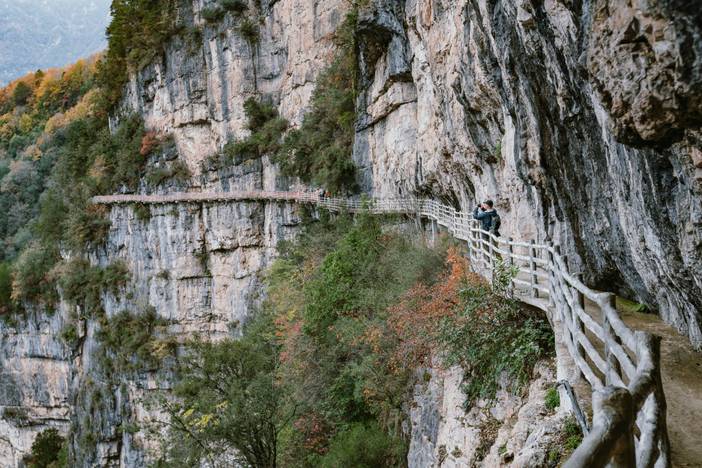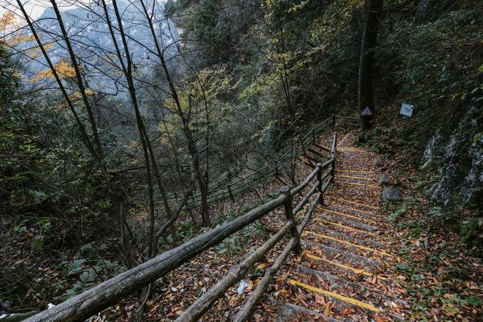 都说光雾山的历史,是一部镌刻在米仓古道上的文明史。与金牛道、荔枝道并称“中国三大古蜀道”的【米仓古道】是中国乃至世界交通史上的活化石。沿着古道慢慢游览,低头找一找青石板上的马蹄印,这是当年盐商牵着马日复一日走过的痕迹。走累了在路边的石凳上休息,指尖抚过历经岁月的石板,红叶飘落在蜿蜒的青石板路上,立刻就能感受到一种幽深的古意,仿佛置身于一幅流动的历史画卷之中。