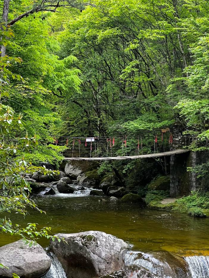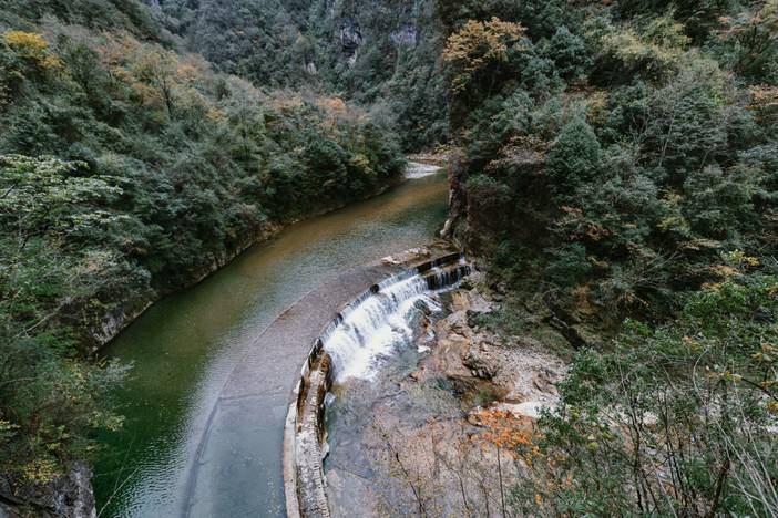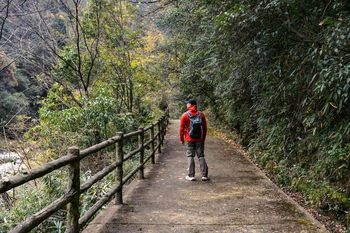 早饭后集合,我们将前往光雾山桃园景区的一大亮点【太极天坑】。河水自东向西将岩溶山体切割出一条S形的河道,俯瞰犹如太极图案,这正是它名字的由来。要看太极天坑的全貌,需要爬1000多个台阶,登山过程中最刺激的是飞云栈道,它像一条细细的带子悬挂在垂直的悬崖上,你可以尽情享受它的惊险刺激,同时遍览群山叠嶂的壮观。