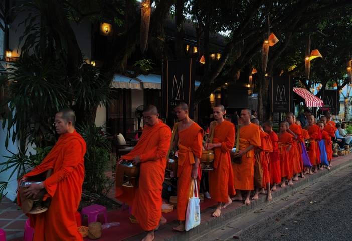 琅勃拉邦的清晨从布施开始,这是老挝佛教僧侣上千年来保持的传统习俗,也是当下全球游客来老挝体验且必不可少的仪式感环节。参加布施的伙伴们今天需早起,前往【僧侣布施】(一般是 5:30 开始,约 30 分钟)。于晨雾中观礼琅勃拉邦著名的仪式(小乘佛教国家特有文化习俗),当地居民对走过的僧侣进行布施,体验老挝人民对于宗教的虔诚与执着。