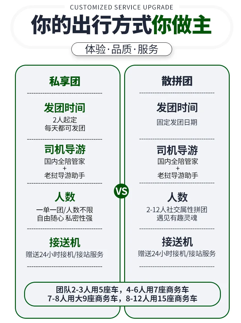 ⑤本产品根据人数安排车辆,不指定车型,若客人指定车型,需加收相应车费。