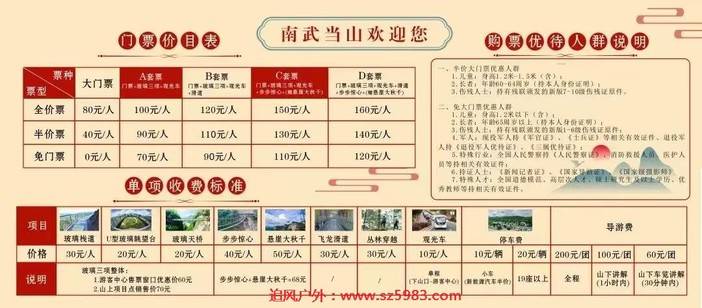 1、龙南小武当门票 A套票:100元 团队价:80元 (含大门票+玻璃桥+玻璃栈道+玻璃跳台+中转车)