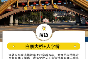 早起,早餐后先前往屏边小众秘境【白寨大桥】,白寨大桥白寨大桥是滇越铁路云南段上最大的、桥墩最高的梁跨上承箱式钣梁米轨高架桥。 和著名的人字桥一样, 由法国巴底纽勒工程建筑公司的董事工程师保罗·波登设计,沿着滇越铁路走过大桥,边拍边留下我们的背影和脚印,近距离感受滇越铁路的魅力。