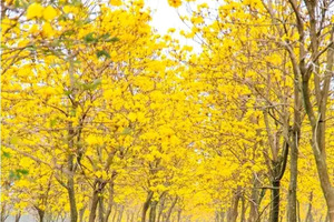 1万多株黄花风铃,步入林中,只见黄灿灿一片,树下五彩缤纷,满树黄花不见一片叶子,真正是满城尽带黄金甲
