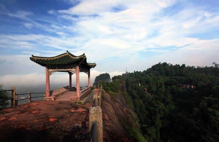 金鸡岭大门拾级而上,就可看到高耸入云,丹崖绝壁的一字峰,一字峰长350余米,宽3-6米,似一巨大屏障,它正看成墙,侧视成峰,俯瞰成龙。 登上一字峰顶,那蜿蜒如练的武江,从湖南流进广东。极目湘粤,远山近河,全镇风貌尽收眼底。一字峰右侧的海螺峰、孔雀峰,神形兼备,栩栩如生,在一字峰的中段耸立着一座清秀的亭子,名“胜清亭”,在胜清亭能猎取到许多观日的倩影。而且胜清亭的来历还有着段太平天国洪秀全的妹妹洪宣娇抗清的传说。岭上至今仍留有许多与洪宣娇的传说和有关遗迹,在点将台上矗立着一尊高大的洪宣娇塑像,她手护战刀,英姿飒爽,注视着前方的练兵场。