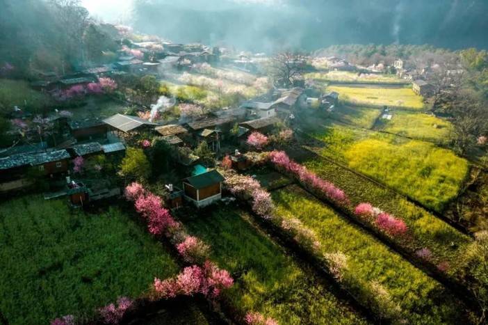 被怒江环抱的桃花岛,原名扎拉桶村,因岛上遍植桃树而得名。每年农历二月至三月,粉白的桃花与金黄的油菜花在梯田间交织,将半岛装点成“峡谷桃源”。在丙中洛最北端,秋那桶村如一颗遗落的明珠静卧于山谷之间。与桃花岛的喧闹不同,秋那桶的桃花开得矜持而热烈,粉白的花瓣随风落入独龙江支流,与远处的嘎娃嘎普雪山构成“天上人间”的奇景。