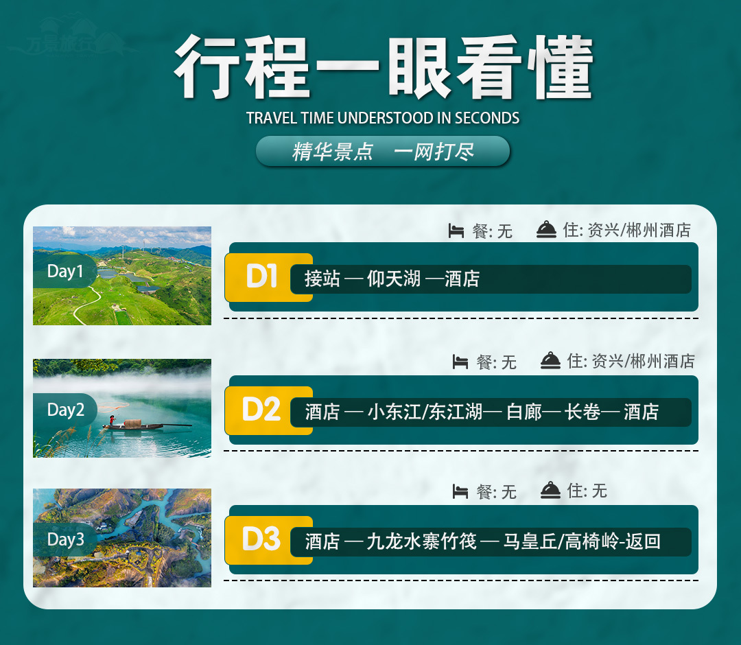 此次旅游总共跨越3天时间,以上行程领队会根据实际情况作相应调整,但总行程不变。