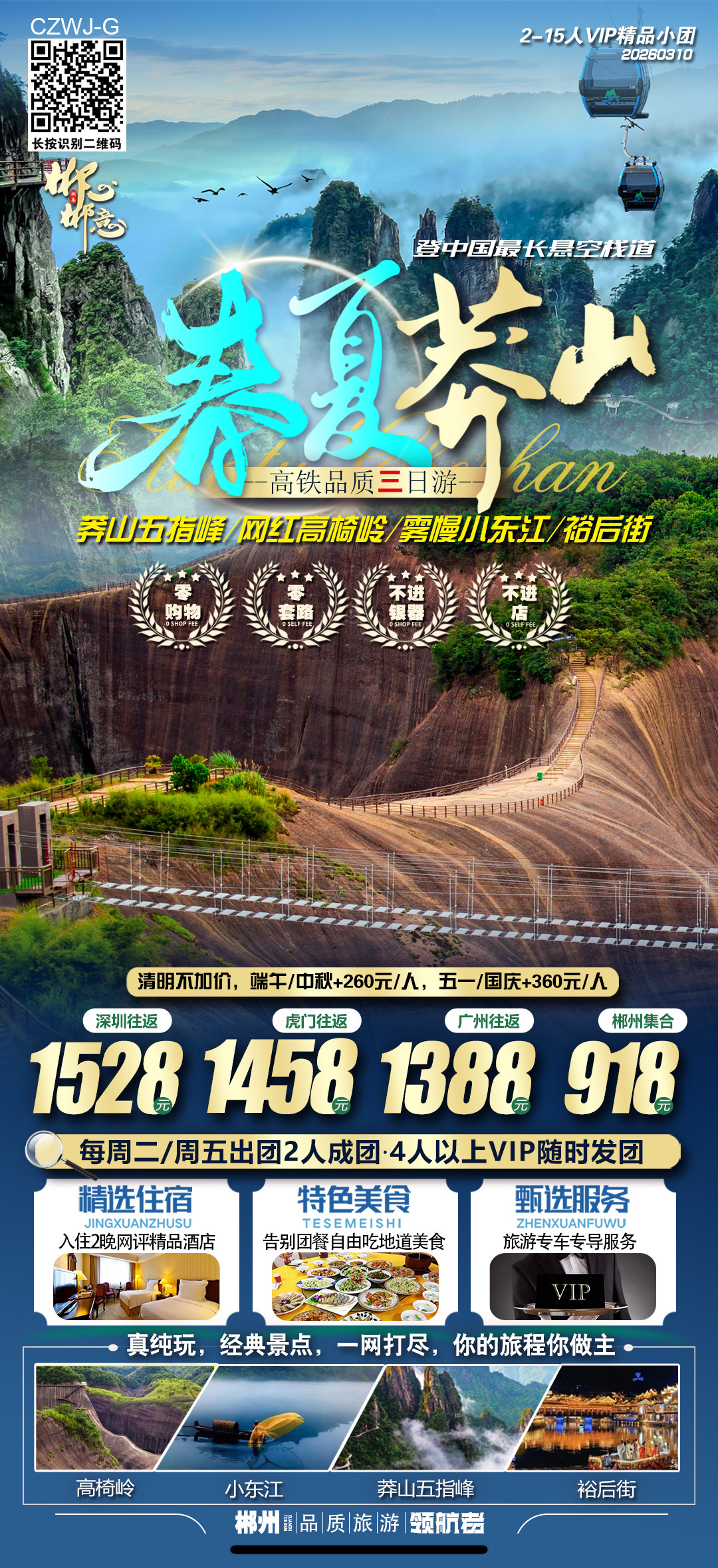 10:00自由到达景区东门口,坐景区接驳车,然后换乘缆车上山(没有其他交通工具,缆车费用自理);南中国最长悬空栈道:乘坐中国目前最长索道单线的观光缆车【五指峰索道】索道全长3.7公里,全国单线最长;每小时客运量达2000人,全国功率最大;全球索道极限高差,达1000米,创造了全国乃至全球索道领域的多项第一,堪称“世界一流、中国第一”五指峰索道。