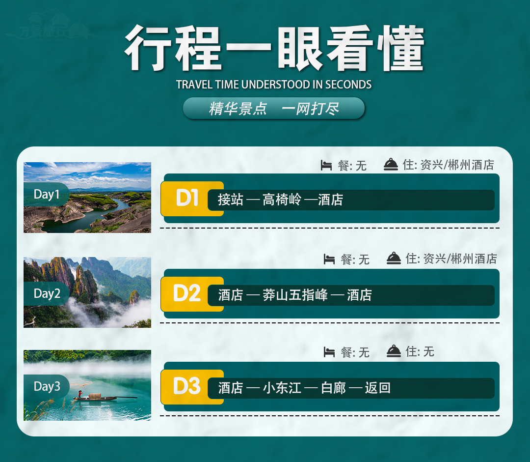 此次旅游总共跨越3天时间,以上行程领队会根据实际情况作相应调整,但总行程不变。