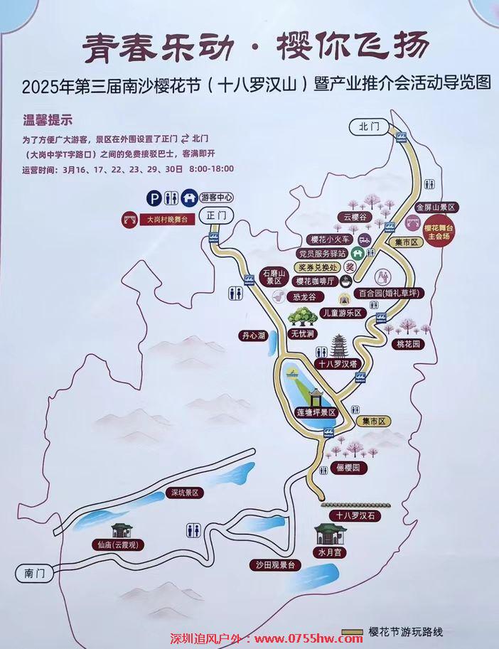 13:00前往南沙【十八罗汉山森林公园】位于大岗镇城区的东南角 ,于 2022 年 1 月 获评国家 3A 级旅游景区。公园内现有十八罗汉塔、十八罗汉石、观音堂、仙庙(云霞观)、水月宫等 著名景点。走进山里, 山峦叠翠 ,绿意盎然 ,空气清新 ,鸟鸣阵阵 ,每一步都是与自然的亲密接触 , 每一石一木都在诉说着古老的传说。这里还是携带亲友祈福许愿的好去处 ,十八罗汉塔、水月宫、仙 庙(云霞观等景点故事传说源远流长。樱花园内种植的是我国自主培育、适合华南地区广泛种植的 优秀樱花品种——广州樱。与其他品种相比,广州樱花型奔放 ,呈粉红色单瓣 ,耐风雨、耐热。漫步樱花园中,花繁艳丽,满树烂漫,如云似霞,美不胜收。(注: