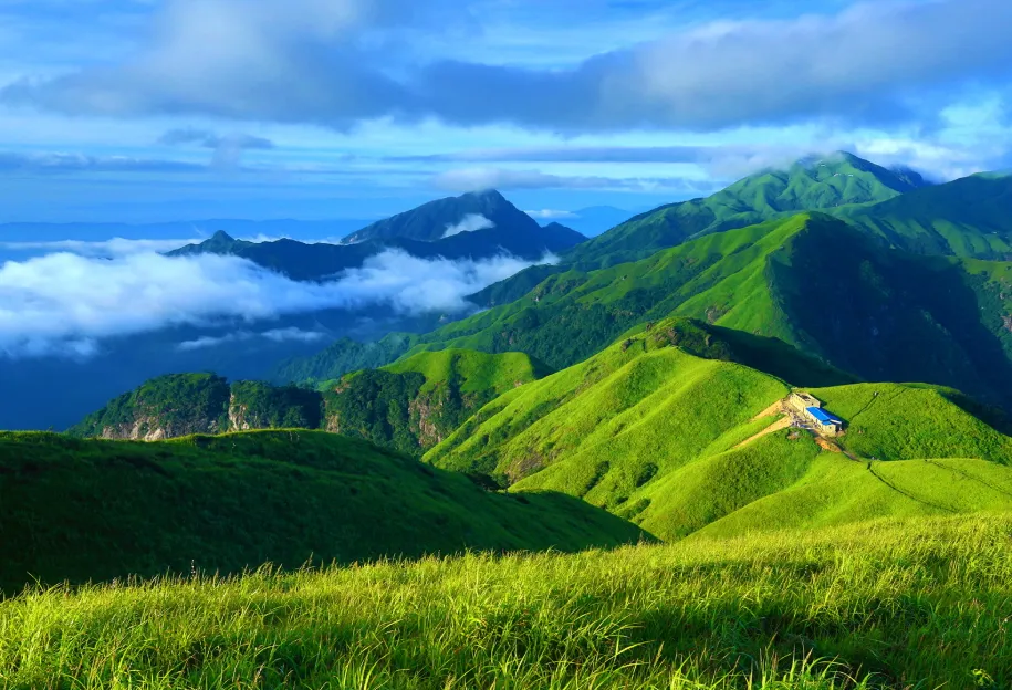 十万亩草甸核心带:从金顶至发云界,连绵不绝的草坡海拔均在1600米以上,春夏绿意汹涌,秋季灿如金原,被誉为“江南生命高原”。