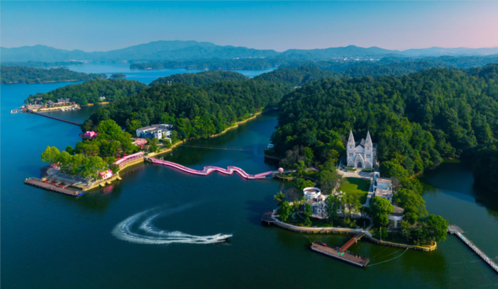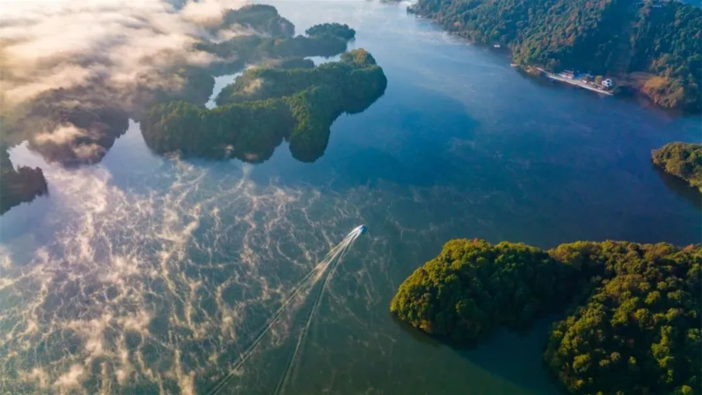 传说在这里落了地,化成一汪碧水,环抱着99座岛屿。水是澄澈的绿,像被仙女们的锦缎裙裾染过;山是温润的青,静静卧在水面,如未写完的诗句。