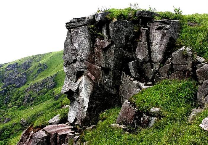 千丈岩:陡峭岩壁与草甸相接,呈现地质变迁的痕迹。