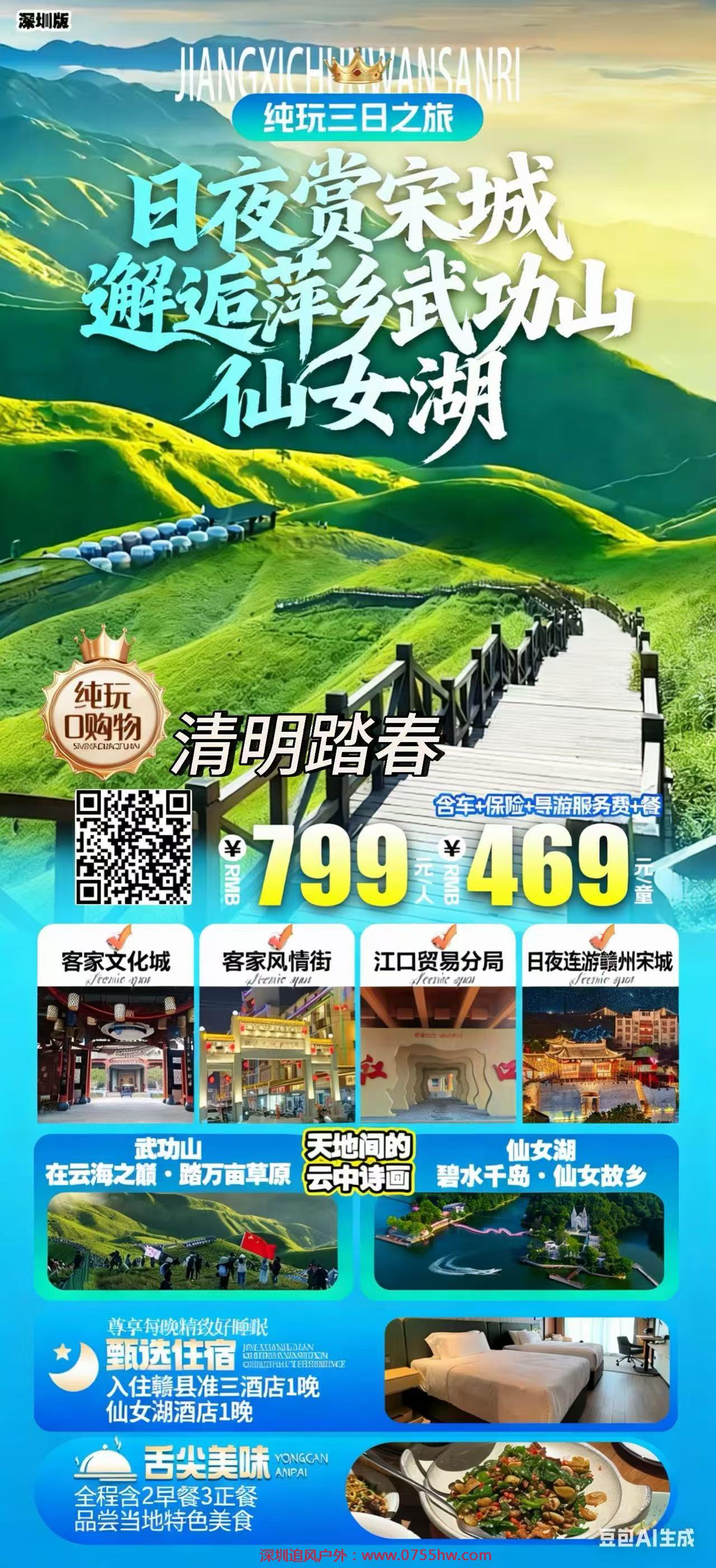 🔥清明出发武功山一价全含 日夜赏宋城・邂逅武功山・仙女湖四岛联游纯玩3日 🎯 成人价:799元/人 (已含武功山4程索道 仙女湖游船 ) |🗓️团期:4月4日(周六)出发 🌉江南宋城 | 一座仍在呼吸的宋代古城活化石 ⛰️ 武功山云海草甸 | 徒步观星,徜徉云端 🛶 仙女湖泛舟 | 碧水传情,神话入梦 🏺 吉州窑探秘 | 木叶天目,千年窑韵 🎫 门票:一价全包·轻松无忧