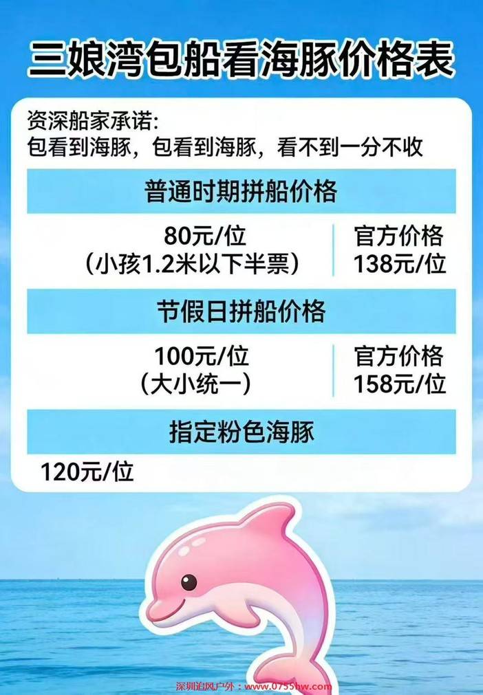 3-5月,三娘湾基本上都难看到海豚,我们现在联系的私人老板承诺的是看不到海豚费用退一半或全退。(包船出海有两种选择,一个正规景区,清明假期是158元一人,另一个是打私人老板租船,费用是100元每人。(如果要指定要看粉色海海豚费用加20元一人)