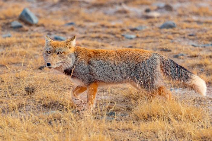 沿着冬格措纳湖边前行,是开展自然观察活动的好地方,靠近湖边的山坡上经常可以拍到独狼或狼群,狼是黄河源园区最常见的食肉动物之一,主要以灰狼为主,夏天常见独狼或小族群,因为夏季的食物充沛,它们不需要集体觅食。