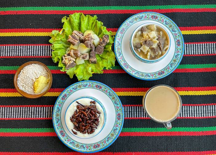 2、藏餐体验(康巴面片、手抓牦牛肉、人参果酸奶、藏式甜茶、糌粑)。