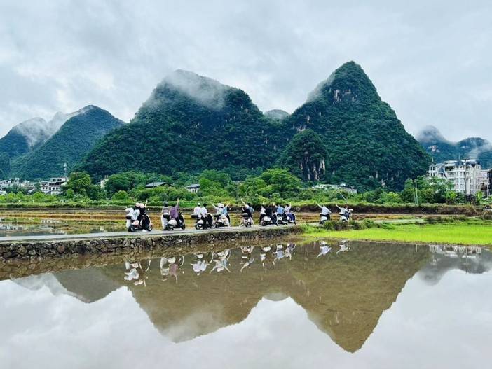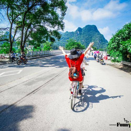 挑选自行车,骑行十里画廊,从阳朔县城出发,经过蝴蝶泉景区,到达遇龙河工农桥码头,往月亮山方向骑,约15分钟车程,即可到达月亮山,打卡月亮山(不爬山),后返回工农桥码头往遇龙河方向骑行,经过大片农田,到达遇龙河著名打卡点--大水车,停好自行车,拍照、闲逛等