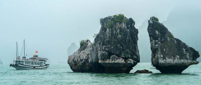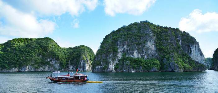 从斗鸡石出发游览下龙湾的精华线路【欧美迷宫仙境】,随着游船观赏一座座的独立仙岩(大拇指山、青蛙山、天鹅山)等千姿百态的景色。下龙湾亦有小渔船如影相随,把酒临风,去国怀乡之忧荡然无存,在天海一色中的游船上大快朵颐的美妙感觉在您的全身悄悄蔓延。