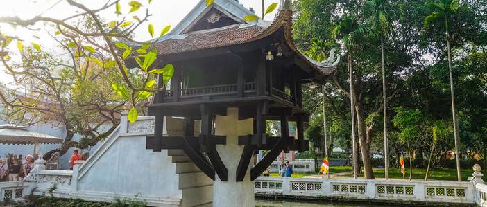 继后参观建于 1049 年的具有佛教色彩的古老寺庙【独柱寺】独柱寺是越南独具一格的古迹之一,因建在灵沼池中一根大石 柱上而得名,是越南标志建筑。后游越南【军事博物馆】。车观【中国驻越南大使馆】、【越南国家歌剧院】。