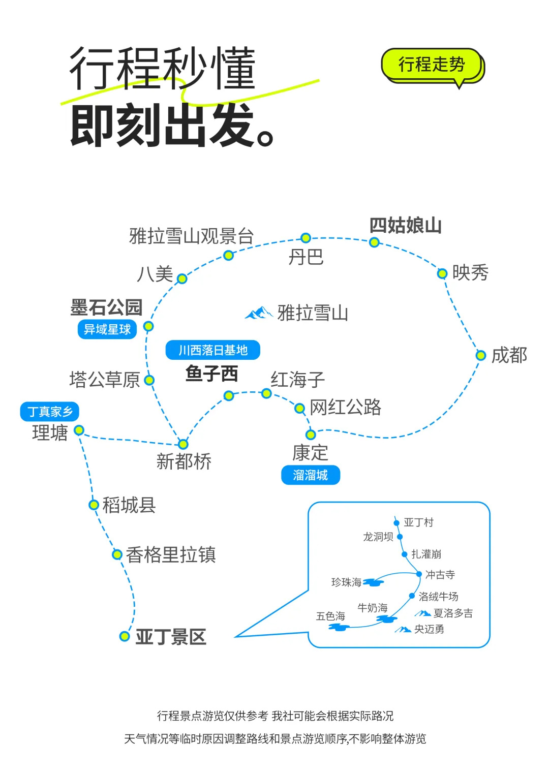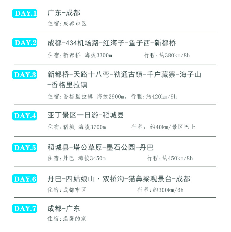 2、如鱼子西和格底拉姆无法前往,替换为八郎生都村、扎真、新都桥观景台等同类型观景点,如产生相关景点中转车、清洁费等费用,需自理。