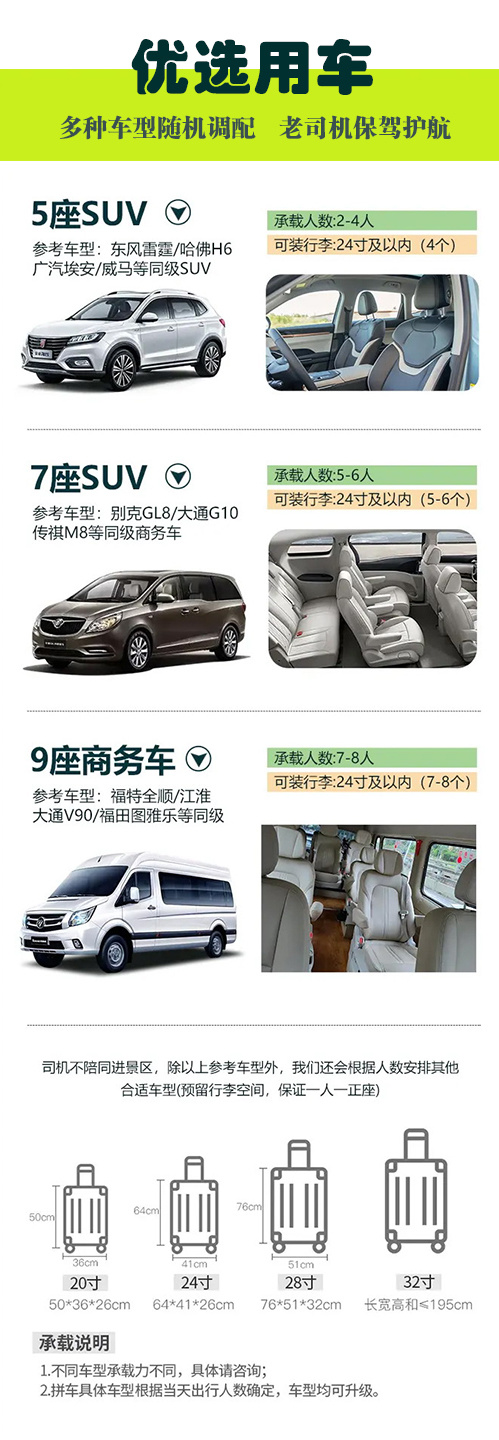 ■根据人数安排用车,5座SUV/7座商务车/9座商务车);保证一人一座,不提供座次要求;