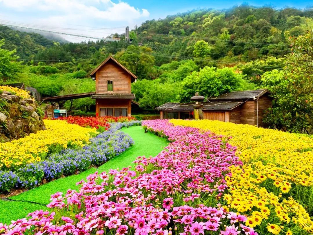 穿过起点梅溪古镇后,一片姹紫嫣红的花谷在周边山峦起伏的衬托下,显得满眼苍翠鲜花形成的美丽色带成为一道别样的风景!