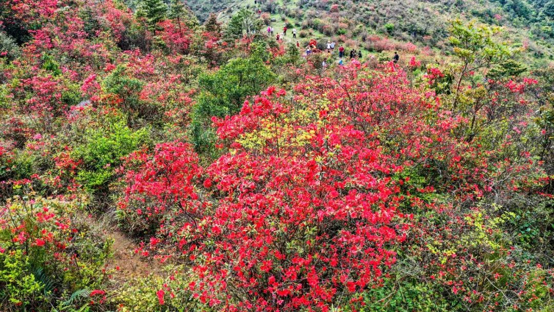 正值杜鹃花开的时节,漫山遍野的红花笼罩着整个山野,染红天空,超级漂亮。
