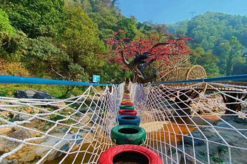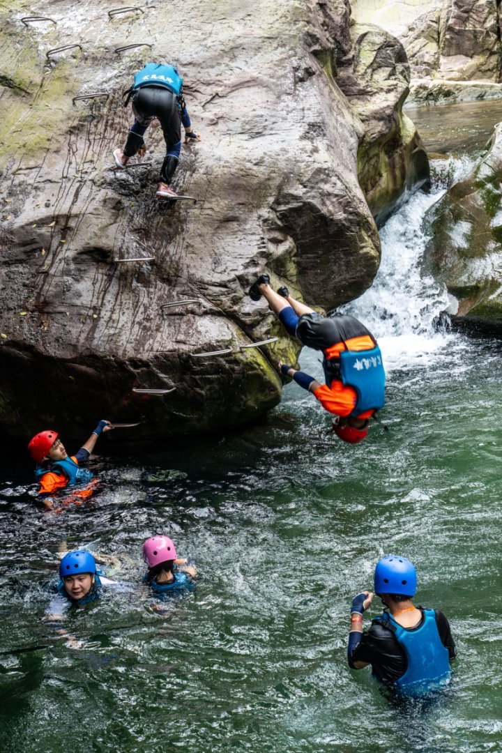 先乘登峰悬空魔毯,到达溪降之王溪降畅玩,让我们从两米左右的崖口,一跃而下,在清澈的翠绿深潭水激起一片劲浪,感受心跳加速的快感!在清溪里游泳,游过清澈见底的山泉水,让清凉浸透全身!在这里,你可以享受到充满动感的溪降之旅,感受大自然带来的最凉爽体验!