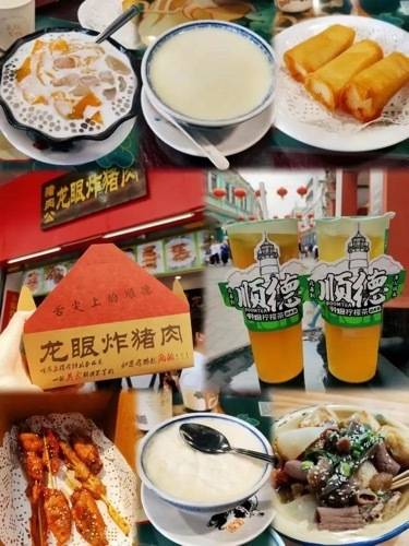 12:00左右华盖路步行街,街道两旁为明末清初骑楼特色的岭南西洋建筑,主色调为粉黄、粉绿、粉蓝。彩色的骑楼,老字号的民信双皮奶店也在此,各类特色小吃众多,大家自由觅食