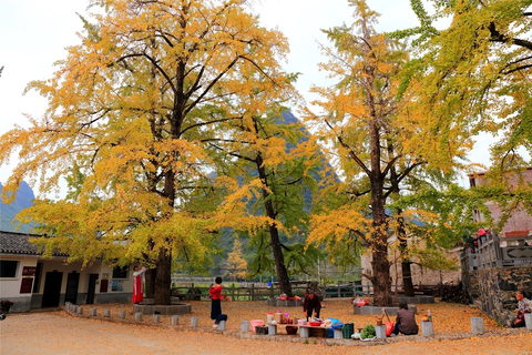 深秋时节,整个村子就成了金色的海洋,微风轻拂,落叶缤纷,片片黄叶随风飞舞,铺得满地金黄,仿如一个迷人的金色童话世界,在秋日的暖阳下让人流连忘返。村头,有村民带这自产的土特产在摆摊。村中,孩子们在银杏林中嬉戏,青砖灰瓦的房顶洒落着厚厚的黄金叶,与树底下的篱笆、近处的小溪、远处的稻田一起,构成一幅悠然恬静的田园风光画。