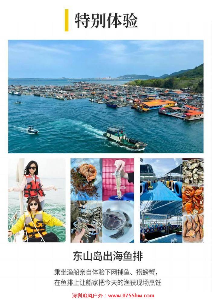 ★★★★★东山出海体验:东山是福建第二大海岛,丰富的渔业资源,碧蓝的大海,丰富的海上娱乐活动,我们将感受新渔民计划:撒网捕鱼-放蟹笼-海钓-玩河豚-海鲜下午茶-生蚝不限量-水果-零食.