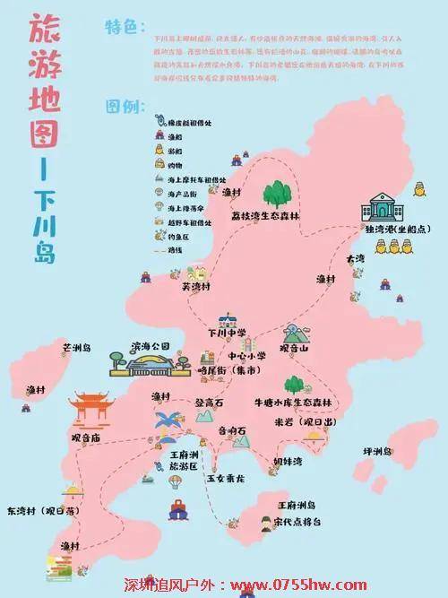 【上下川岛介绍】上下川岛-上川岛、下川岛隶属于广东省台山市,位于碧波荡漾的南海之中,地处北回归线南侧,北纬22°,属亚热带海洋性季风气候,年平均气温23℃,气候温和,四季如春。这两个美丽的岛屿,以其独特的地理环境、浓郁的岭南民俗,绮丽的海洋风情、神秘的宝藏传说,闻名港、澳、台,享誉东南亚,是理想的海滨度假旅游胜地。 素有‘南海碧波出芙蓉’之称的上川岛,是广东沿海最大的岛屿。它由一个主岛和12个小岛组成,全岛面积156.7平方公里,人口1.6万,12个小岛众星拱月般环绕着主岛,是南中国海上的一颗璀璨夺目的明珠。