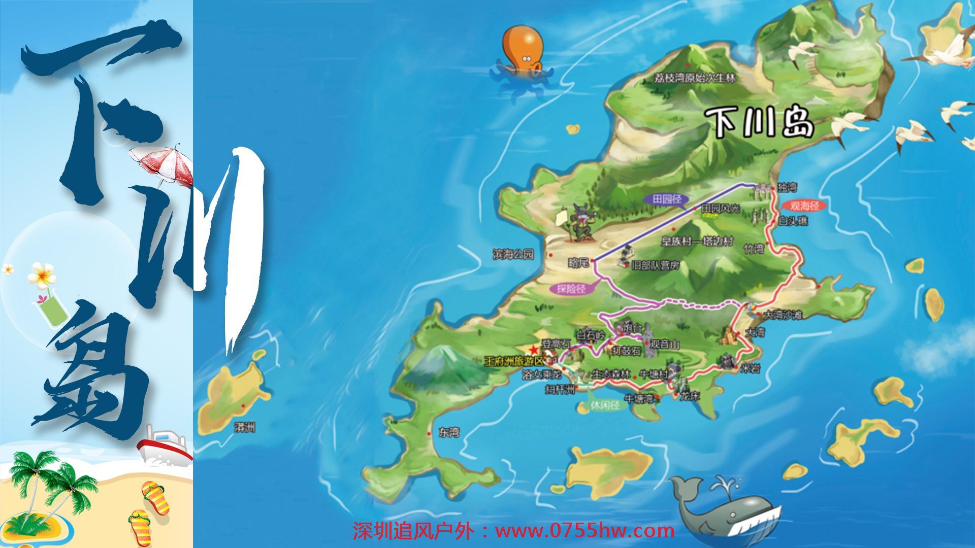 下川岛位于上川岛南侧6海里外,与上川岛毗邻相望,面积98平方公里,人口1.8万。海岸线长187海里,是个风景宜人的小岛,岛的四周海面有茫洲、坪洲、水壳洲、山猪洲、王府洲等14个小岛洲,下川岛属亚热带气候,长期受海洋季风影响,阳光充足,气候温和,四季如春。