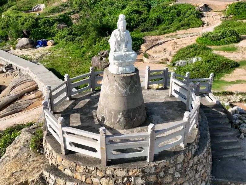 靠近岬湾的巨岩旁建有一座“观音宫”,内供观世音雕像,宫门两旁镌刻一副联内嵌入“南海观世音”五字的对联:观天有色西江月,听世无音南海潮。
